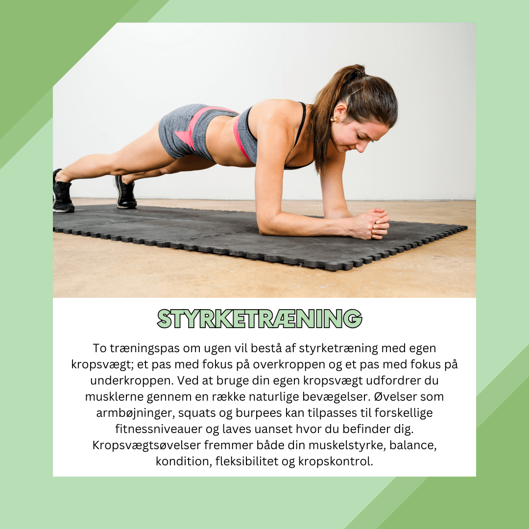 - Styrke (over- og underkrop) – med egen kropsvægt