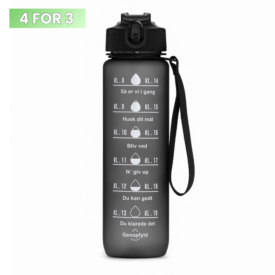 Den Originale Motivationsvandflaske med tidspåmindelser, one-click åbning, sugerør, opvaskemaskinesikker, 100 % tæt og BPA-fri.