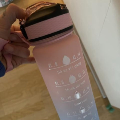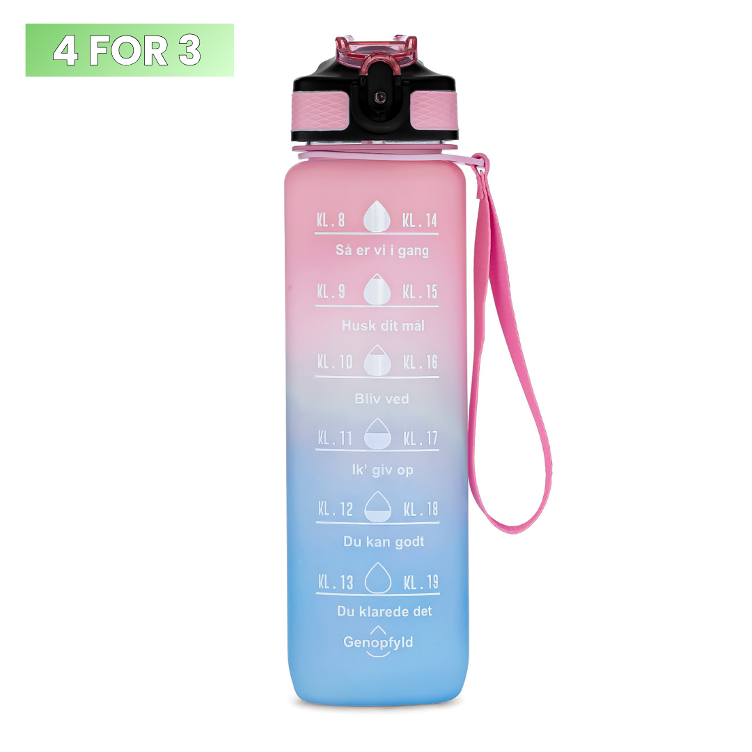 Den Originale Motivationsvandflaske med tidspåmindelser, one-click åbning, sugerør, opvaskemaskinesikker, 100 % tæt og BPA-fri.