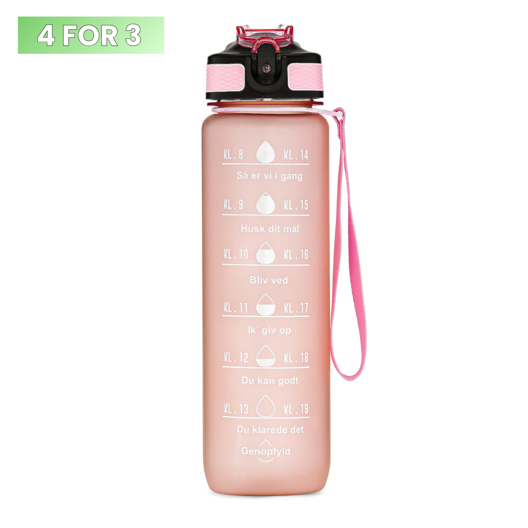Den Originale Motivationsvandflaske med tidspåmindelser, one-click åbning, sugerør, opvaskemaskinesikker, 100 % tæt og BPA-fri.
