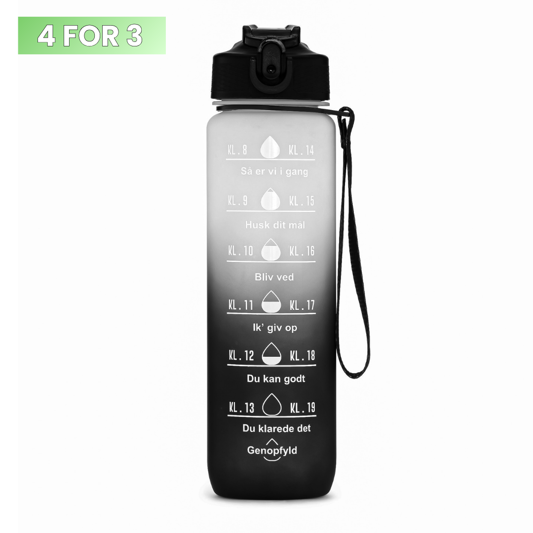 Den Originale Motivationsvandflaske med tidspåmindelser, one-click åbning, sugerør, opvaskemaskinesikker, 100 % tæt og BPA-fri.